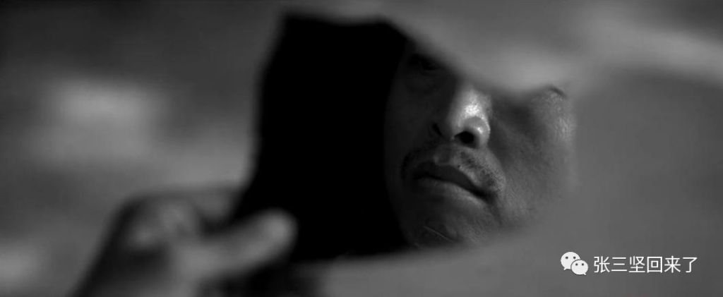 The first shot of the film shows a weathered, rough face in a broken mirror, with the protagonist trimming his beard holding a corner of the shattered mirror. This shot is worth contemplating. If we revisit this scene after watching the entire film in a reverse order, it essentially conveys the protagonist’s ruined and incomplete life from the beginning, foreshadowing his fragmented existence. The broken mirror reflects the face he imagines himself to have – an unsmiling, colorless visage. This austere black and white texture is consistent throughout the film.