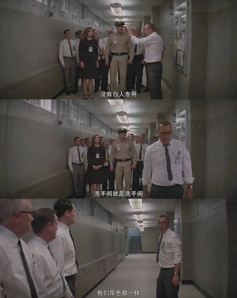 歧视不是“人对人就某个缺陷、缺点、能力、出身以不平等眼光对待”,是凯瑟琳刚进办公室,就被当做清洁工要求她处理垃圾;是与男性同事同处一间办公室引来注视;是乘公交车不配拥有座位;是她需要花二十分钟前往另一栋楼的“有色人种女性专用厕所”;是她用完公用咖啡壶后,那个咖啡壶就无人再用了。
