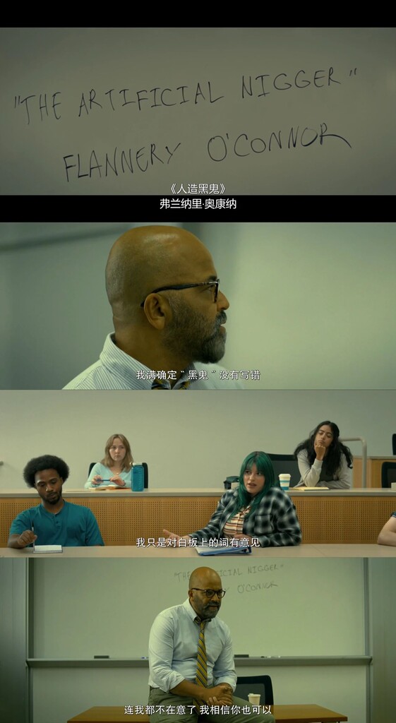 这部白人导演的黑人电影拿了奥斯卡五项提名,最终获得最佳改编剧本。主人公蒙克是位大学老师兼作家,职业体面,生活也是中层阶级以上水平,影片开头他在课上直言不讳地谈论黑人文学,写出了一个冒犯黑人的词,反而让一个白人女学生感受到了伤害,最终他被强制休假。
