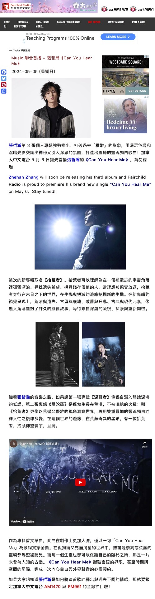 Zhang Zhehan’s third solo album makes a powerful debut! Breaking away from his previous “boyish” image, conveys a contemplative and mysterious atmosphere with its deep tones and dark shadows, creating stunning soulful monologue songs! Don’t miss the exclusive premiere of Zhang Zhehan’s “Can You Hear Me” on the Fairchild Radio on May 6th!