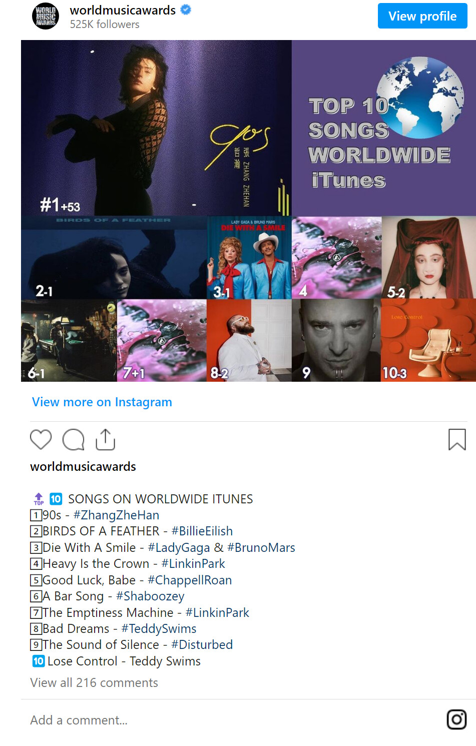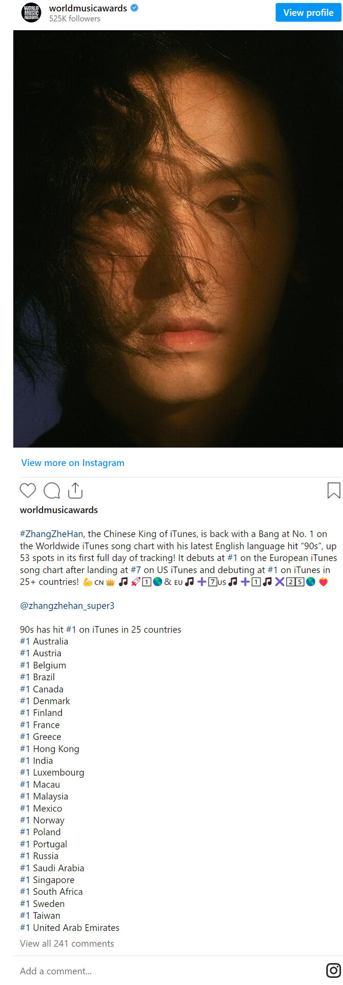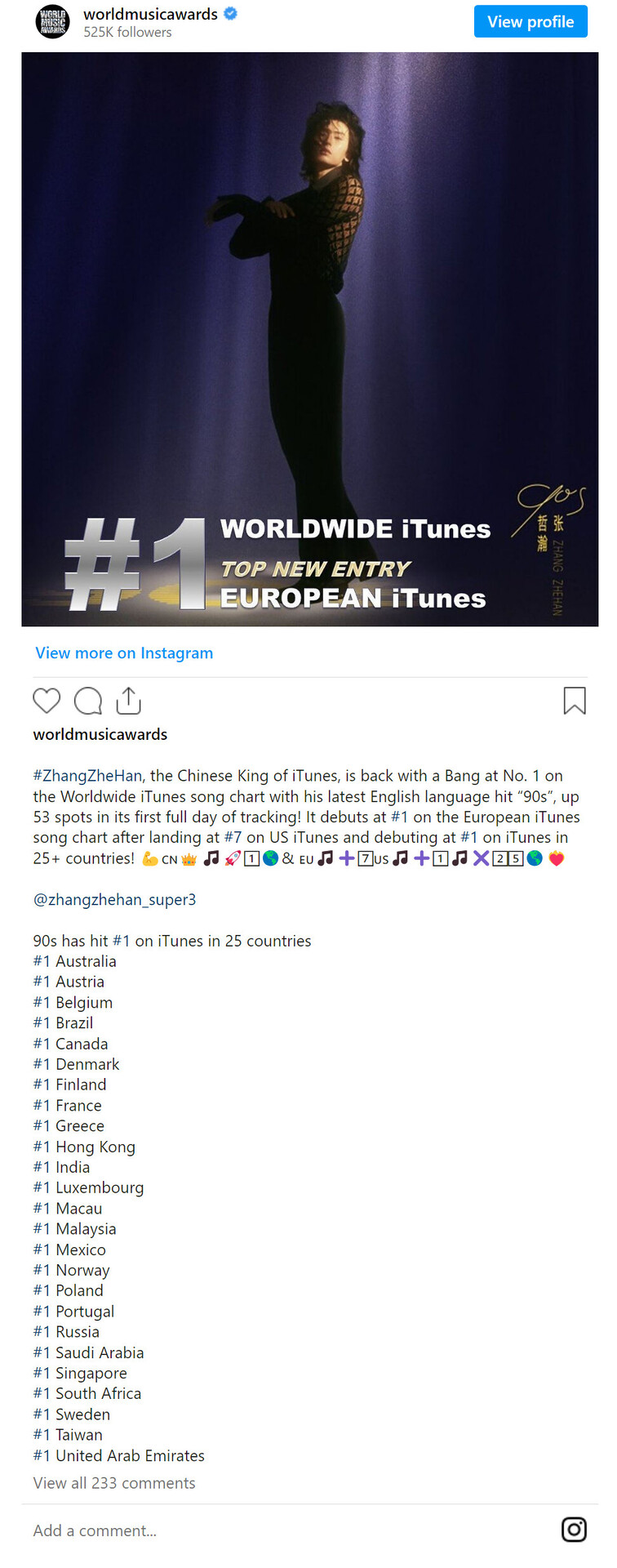 World Music Awards: ZhangZheHan, the Chinese King of iTunes, is back with a Bang at No. 1 on the Worldwide iTunes song chart with his latest English language hit “90s”, up 53 spots in its first full day of tracking! It debuts at #1 on the European iTunes song chart after landing at #7 on US iTunes and debuting at #1 on iTunes in 25+ countries! 💪🇨🇳👑🎵🚀1⃣🌎& 🇪🇺🎵➕7⃣🇺🇸🎵➕1⃣🎵✖️2⃣5⃣🌎❤️🔥