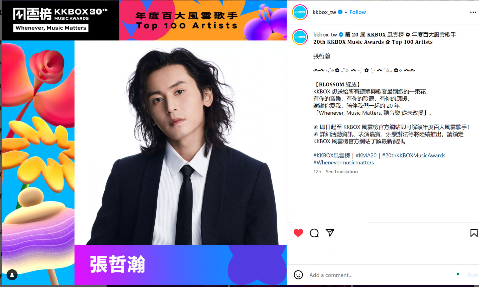 张哲瀚荣获第 𝟐𝟎 屆 𝐊𝐊𝐁𝐎𝐗 風雲榜 年度百大風雲歌手称号 Zhang Zhehan is named 𝟐𝟎𝐭𝐡 𝐊𝐊𝐁𝐎𝐗 𝐌𝐮𝐬𝐢𝐜 𝐀𝐰𝐚𝐫𝐝𝐬 𝐓𝐨𝐩 𝟏𝟎𝟎 𝐀𝐫𝐭𝐢𝐬𝐭𝐬