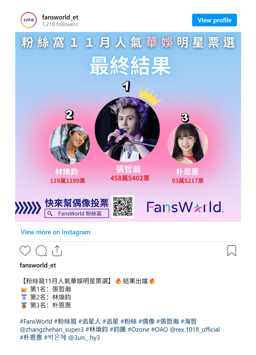 ETtoday华娱明星人气票选 – 张哲瀚第八个月蝉联冠军 ETtoday’s Popularity Poll – Zhang Zhehan Winning Streak Reached Its 8th Month